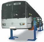 г/п 24 тонны. Передвижной. Шестистоечный. Электромеханический. Привод червячный редуктор. Многоуровневая система безопасности. Оснащен концевыми выключателями нажимного действия ограничивающими ход каретки вверх и вниз. Комплектуется 4 страховочными подставками. Для подъёма безрамных авто (автобусы, троллейбусы, трамваи) за поддомкратные площадки. Поставляется в 2 вариантах Стандарт (в помещение) и ТЗ (Для эксплуатации на улице).