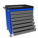 С 7 ящиками. Округлая форма бортовой ручки тележки. Корпус тележки оснащен защитными бортами, что сводит к минимуму риск повреждения оборудования и нанесение травм автомеханикам во время перемещения по СТО. Выдвижные ящики оснащены нескользящими вкладками. В комплекте предусмотрен верхний коврик из EVA, предназначенный для удобного хранения различных мелких деталей. Роликовые направляющие с функцией автоматического возврата обеспечивают плавность открывания/закрывания ящиков. Максимально возможная нагрузка на тележку: 450 кг.