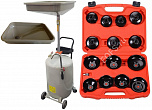 Комплект из TS-2081 маслосборника. Для быстрого слива (самотеком) масла и антифриза из ДВС, КПП и мостов всех авто. В комплекте: Сливная чаша. Лоток для сливной пробки. Металлический пистолет для откачки масла. Обрезиненная ручка для транспортировки. Колёса пластиковые – 2 прямых + 2 поворотных позволяет перемещать по любой поверхности цеха. Вмещает 90 л. + ES0901 Набор съемников масляных фильтров ("чашки") - 15 шт.