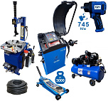Комплект: шиномонтажный станок TS-21 для дисков: внешний 11÷20” + пистолет с манометром для подкачки шин + монтажка + пластиковые накладки на зажимные кулачки + регулятор давления с влагоотделителем и манометром. + TS-500 балансировочный станок с автозапуском, для колес легковых автомобилей и легких грузовиков, диаметр диска с резиной до 760 мм. размеры диска: ширина 3"–9” (76-228 мм), диаметр диска 10"–21” (254-533 мм). + кожух защитный + клещи + кронциркуль + быстрозажимная гайка + набор конусов + подкатной домкрат г/п 3,0т. 130-465мм. + ударный пневмогайковерт 1/2" крутящий момент 745Нм + шланг кислородный 9мм 20Атм. 10м