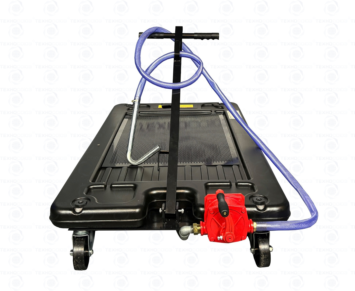 Подкатная установка для слива масла 81л, «отработки», антифризов из ДВС, КПП, мостов грузовиков, тракторов с клиренсом от 250мм. Регулировка угла наклона рукояти 0˚÷150˚. Слив из установки в бочку ручным шестерёнчатым насосом. Сетка улавливает мелкие детали и предотвращает разбрызгивание. Вес 19кг.