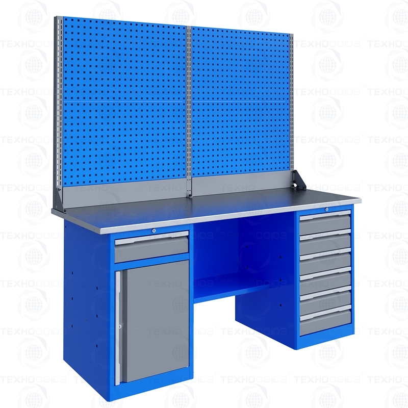 Двухтумбовый. Допустимая нагрузка на столешницу 1000 кг. Опорные элементы выполнены сварными из холоднокатаной стали. Для выполнения сборочных, ремонтных, слесарных, монтажных и других видов работ на производстве, в сервисных центрах, мастерских, гаражах, а также для обучения технологии в учебных заведениях. Комплектуется полкой-стенкой, расположенной под столешницей для удобного размещения габаритного инструмента и оснастки. Размеры верстака: 855x1796x696 мм. Вес: 113 кг. Поставляется в 4 комплектациях на выбор.